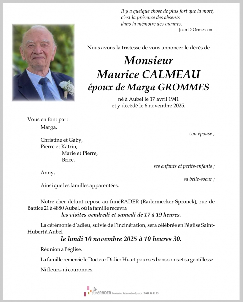 La famille annonce le décès de Monsieur Maurice CALMEAU, époux de Madame Marga GROMMES, né à Aubel le 17 avril 1941 et y décédé le 6 novembre 2025.
