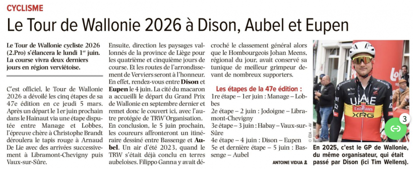 Un article d'ANTOINE VIDUA dans L'AVENIR - LE JOUR VERVIERS du 6 mars 2026
