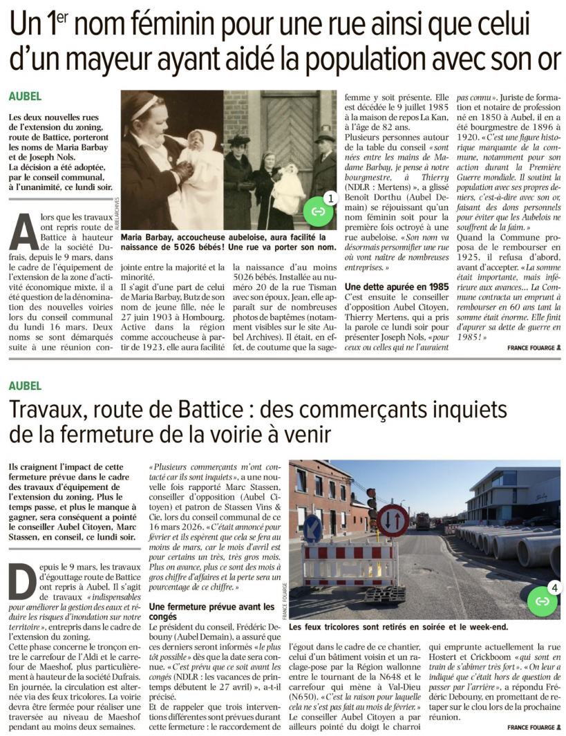Pour Madame Barbay, c' est bien. Elle a aidé bcp d' Aubeloises à accoucher. Et bcp d'Aubelois se souviennent d' elle. Elle passait en vélo ds les rues d' Aubel. Le Bourgmedtre Nols, on ne l' a pas connu. Tous ses contemporains sont décédés évidemment. Baptiser une rue à son nom plus de 100 ans après son décès, bof...Par contre, on aurait pu baptiser cette rue " Zélie Nyssen", reconnue Juste parmi les Nations par le Musée Yad Vashem à Jérusalem. Et nous sommes encore bcp à l' avoir connue. Dommage que Madame Nyssen n' a pas une rue à son nom. On a raté une occasion. Je le répète, c' est dommage.