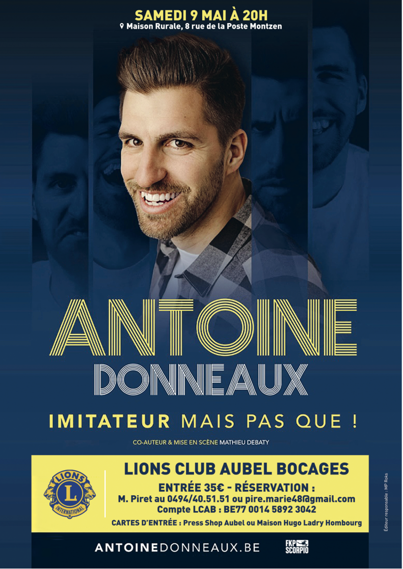 Le Lions Club Aubel Bocages a le plaisir de vous convier au spectacle d'Antoine Donneaux, le 9 mai 2026