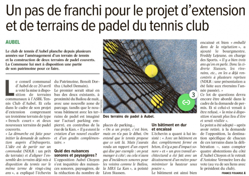 13h01 23 avril 2026 Projets d'extension Tweet Un article de FRANCE FOUARGE dans laljv du 23 avril 2026. Lien permanent Catégories : Tennis 0 commentaire